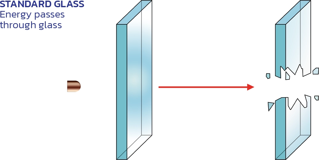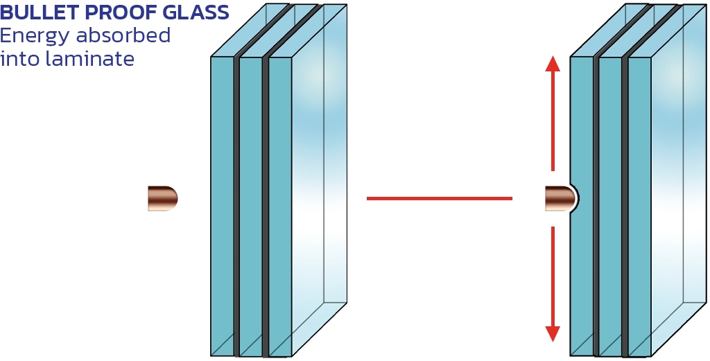 เพื่อป้องกันกระสุนปืนชนิดต่างๆ ที่มีความรุนแรงต่างกัน กระจกกันกระสุนจึงมีจำนวนชั้นและความหนาแตกต่างกันไป รวมทั้งชนิดของฟิล์มที่ใช้ก็แตกต่างกันออกไปด้วย เมื่อถูกกระแทกจากกระสุนปืนหรือวัตถุอื่นๆ ชิ้นส่วนที่แตกจะไม่หลุด ออกจากกัน ยังคงสภาพเดิมเพียงแต่มีรอยร้าวเกิดขึ้นบนแผ่นกระจกเท่านั้น นอกจากนี้ถ้าต้องคำนึงถึงแรงกระแทกที่มา จากกระสุนทางด้านนอก และความปลอดภัยจากเศษกระจกที่อาจจะกระเด็นออกมาได้เมื่อถูกกระสุนก็สามารถเลือกใช้ ฟิล์มต่างชนิดกันระหว่างด้านในและด้านนอกได้