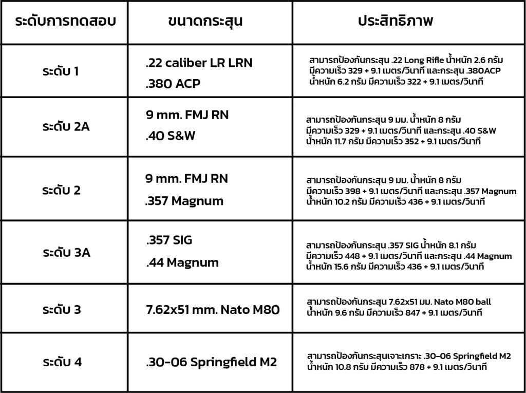 ระดับชั้นของการออกแบบกระจกกันกระสุน เพื่อคัดแยกชั้นคุณภาพของกระจกกันกระสุน NIJ ได้แบ่งระดับการทดสอบโดยใช้ขนาดของกระสุน และค่าความเร็วของหัวกระสุน ไว้ดังนี้