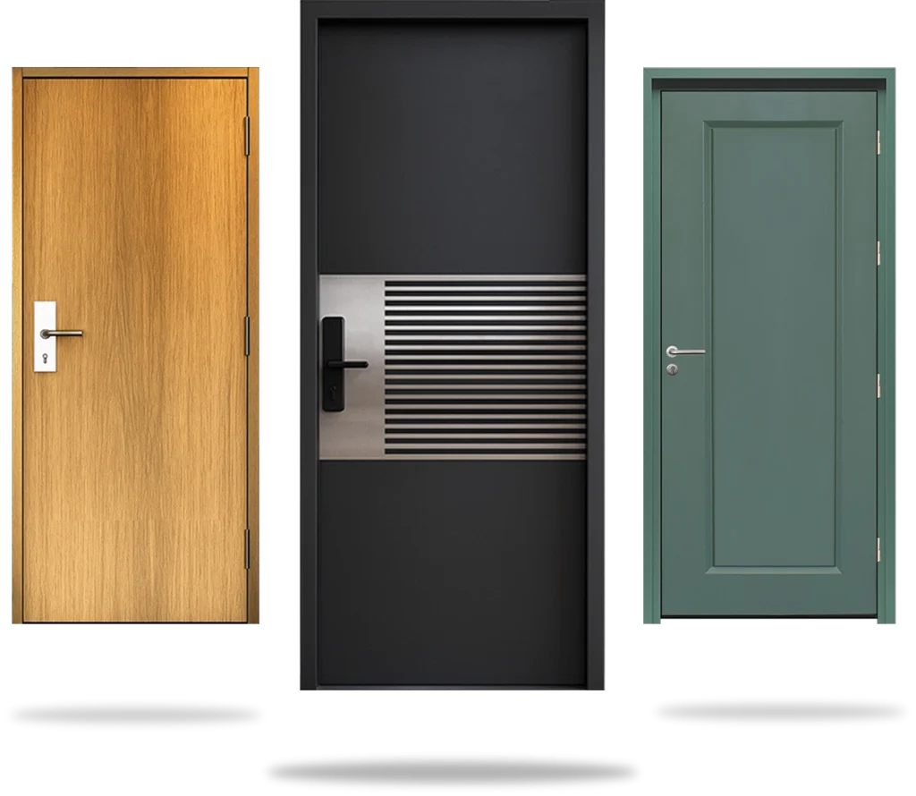Beautiful doors and standard steel doors are available in various styles, including powder-coated doors, steel doors overlaid with PVC or laminate sheets, and laser-cut patterned doors — all designed under the concept of beauty, safety, strength, durability, and excellent anti-theft protection.